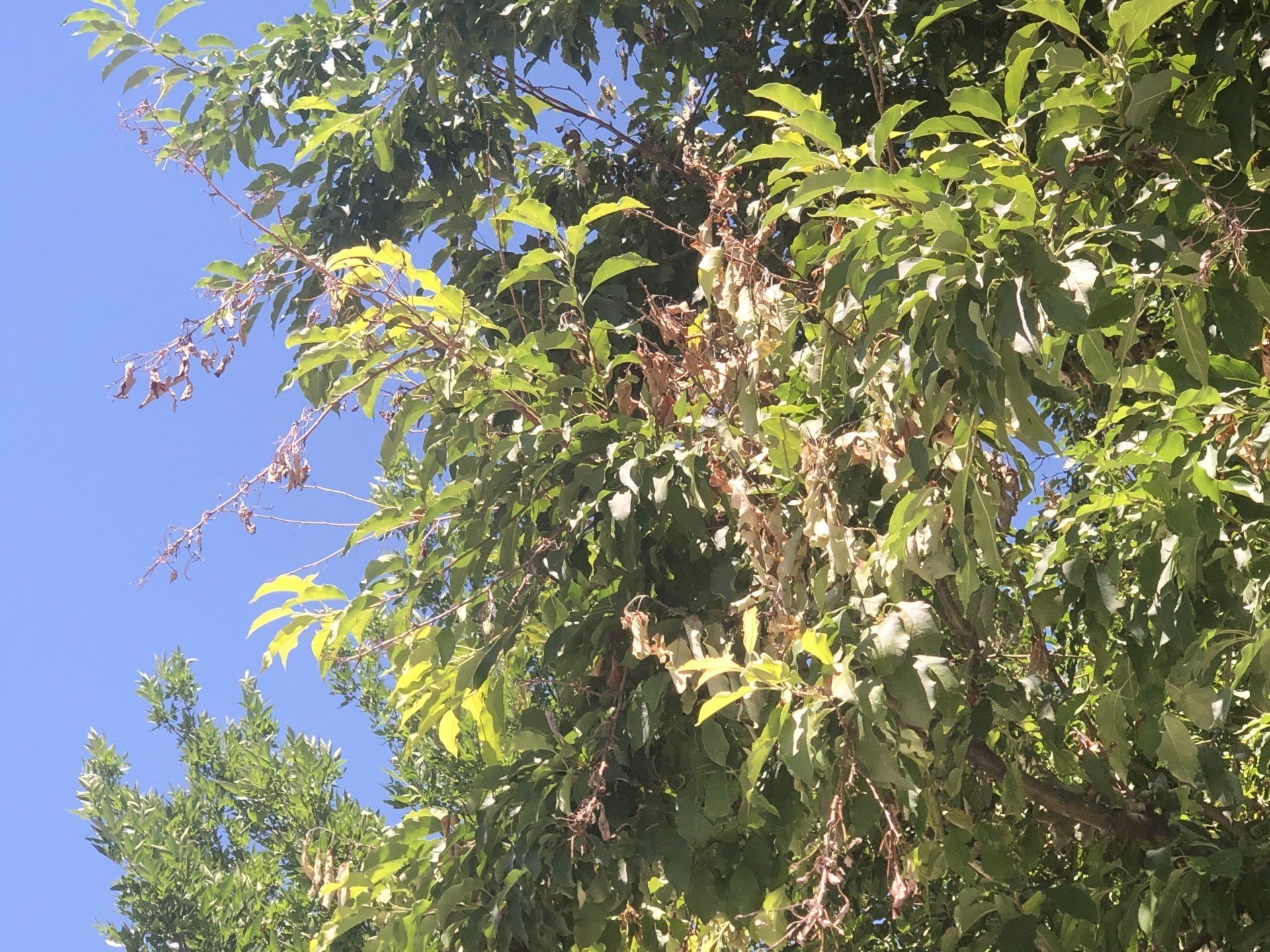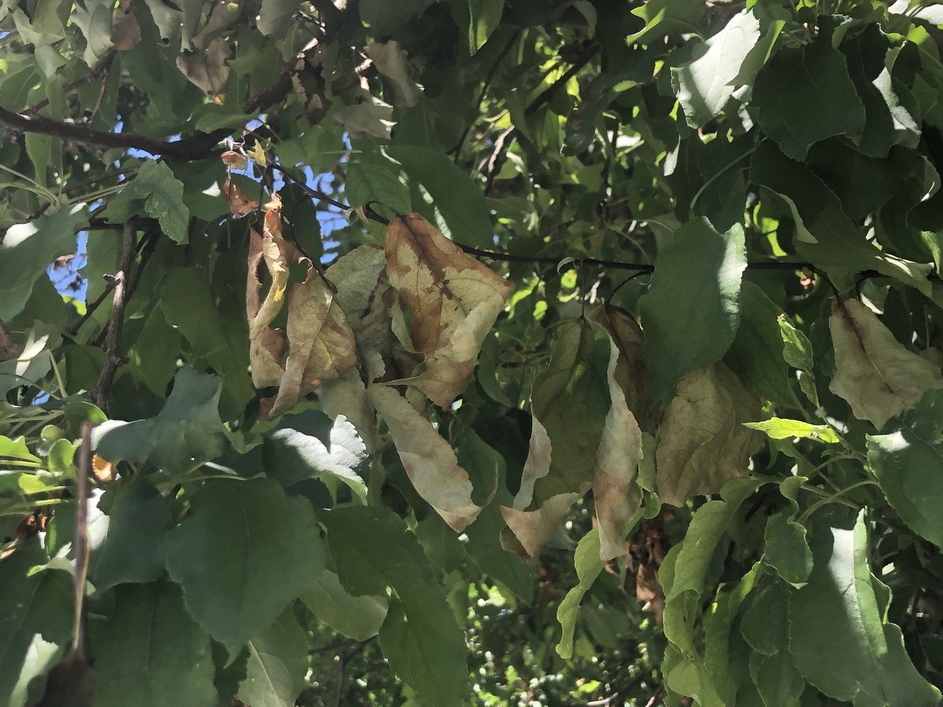 Here in Colorado, the trees typically damaged by fire blight are apple, crabapple, pear, hawthorn, and mountain ash. Fire blight is a bacteria (Erwinia amylovora) that damages trees in the family Rosaceae. The bacteria reproduce in the vascular system of the tree, preventing water and nutrients from properly circulating. This bacteria will live in the tree indefinitely and can eventually kill entire branches if not addressed. The easiest way to identify fire blight is by shoots dying back during the growing season. Affected branches will have a burnt appearance, hence the name - fire blight.