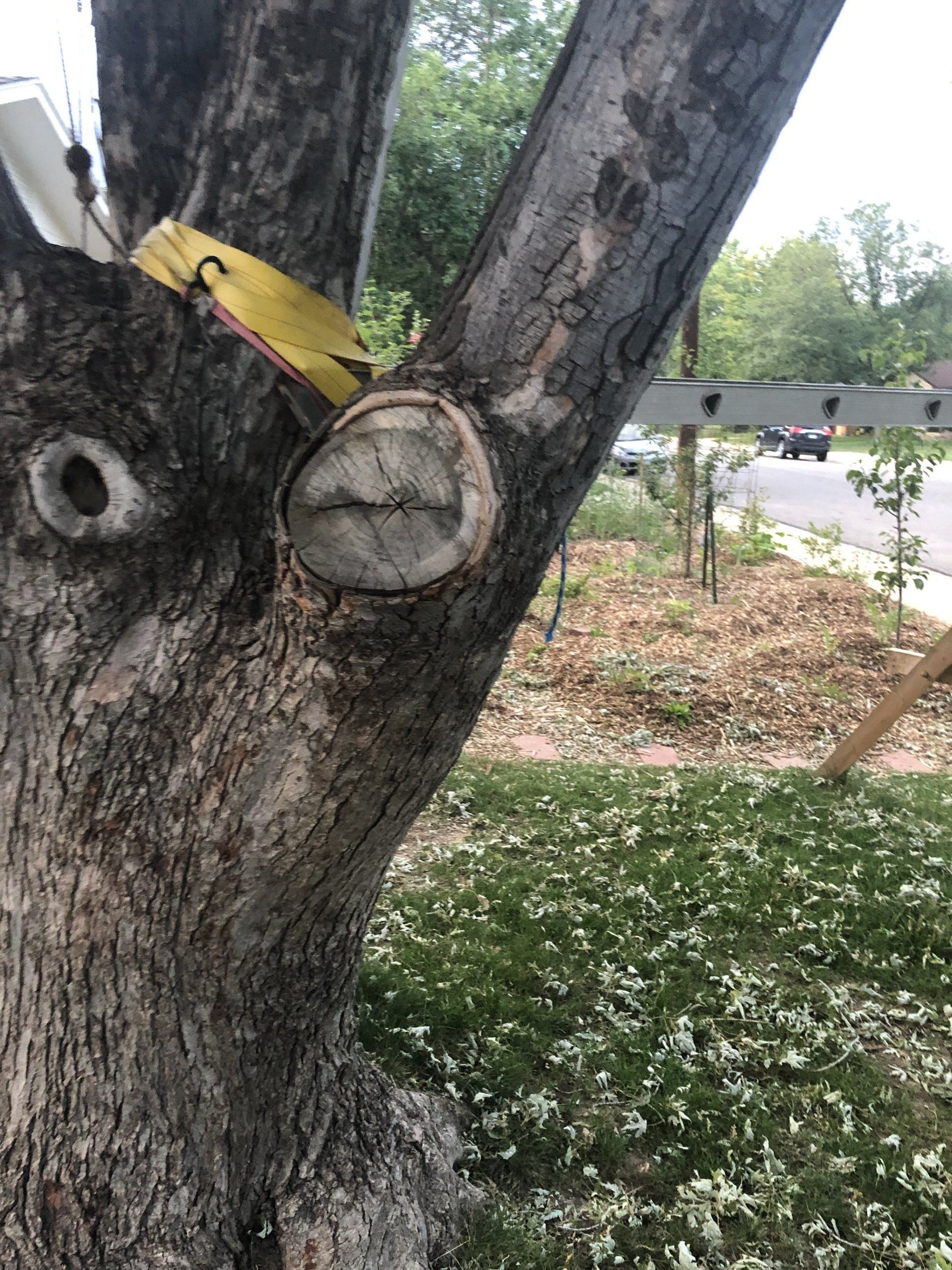 - Below is a photo of a tree in a park in Louisville with an included bark union. These two branches compete with each other for and do not form proper wood in between the two stems. This forms a weak spot that is more prone to breakage in storms. (photo 4)