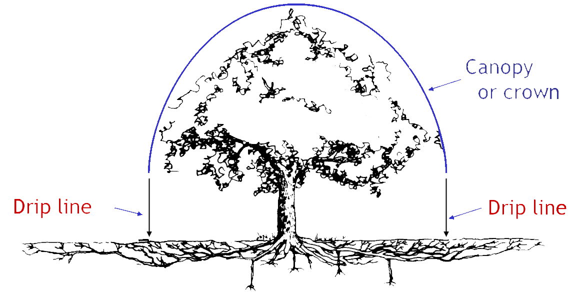 Typically trees need 1-2 inches over the drip line of the tree once or twice a month. If your grass receives regular watering then your tree roots under that area are likely fine. Each watering you should aim to get 2 inches of water over the entire unirrigated root zone. During months where there is less than 2 inches of rainfall but temperatures aren’t regularly above 85 degrees I recommend watering once. If temperatures are over 85 degrees I recommend watering twice.
